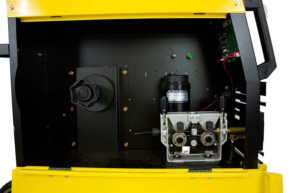 - Работа с надежным механизмом подачи сплошной и порошковой проволоки.