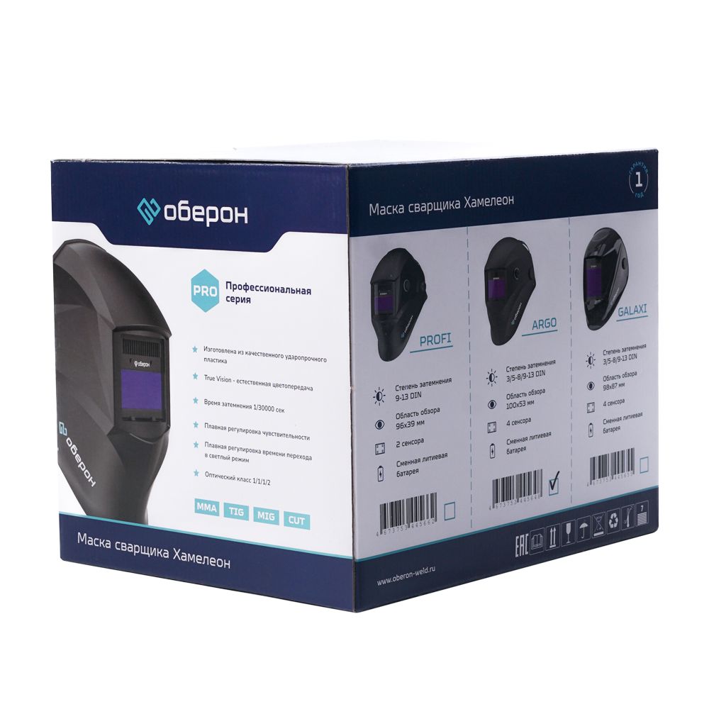 Маска сварщика Хамелеон Оберон GALAXY (BLACK) с автоматическим светофильтром защищает глаза и кожу лица сварщика от искр, брызг и вредного излучения при нормальных условиях сварки. Светофильтр типа «Хамелеон» обеспечивает автоматическое затемнение при зажигании сварочной дуги. В маске установлен светофильтр True Vision, который обеспечивает лучшую цветопередачу сварочного процесса, отображает большее количество цветов, полутонов и оттенков. Это облегчает процесс сварки и делает работу более комфортной. В качестве источника питания в маске используются солнечные и литиевые аккумуляторы длительного срока эксплуатации. Светофильтр оборудован светодиодным индикатором, который всегда оповестит сварщика о необходимости замены батареи, что поможет защитить его глаза. Скорость перехода светофильтра из светлого состояния в темное составляет 0,03 мс, таким образом глаза эффективно защищаются от повреждения мгновенного дугового света. В маске установлен светофильтр с регулируемой степенью затемнения в диапазоне 5–8 и 9–13 DIN. Удобный наголовник для маски сварщика оснащен 4-реечным механизмом настройки. Расстояние от лица до маски можно регулировать, выбирая из шести различных положений. Также предусмотрено девять различных углов для поднятия и фиксации маски. Сбалансированная и легкая конструкция, специальная поворотная система крепления значительно снижают усталость головы и шеи сварщика и повышают комфорт. Средства защиты имеют декларацию о соответствии ЕАС ответствует требованиям ТР ТС 019/2011 «О безопасности средств индивидуальной защиты».