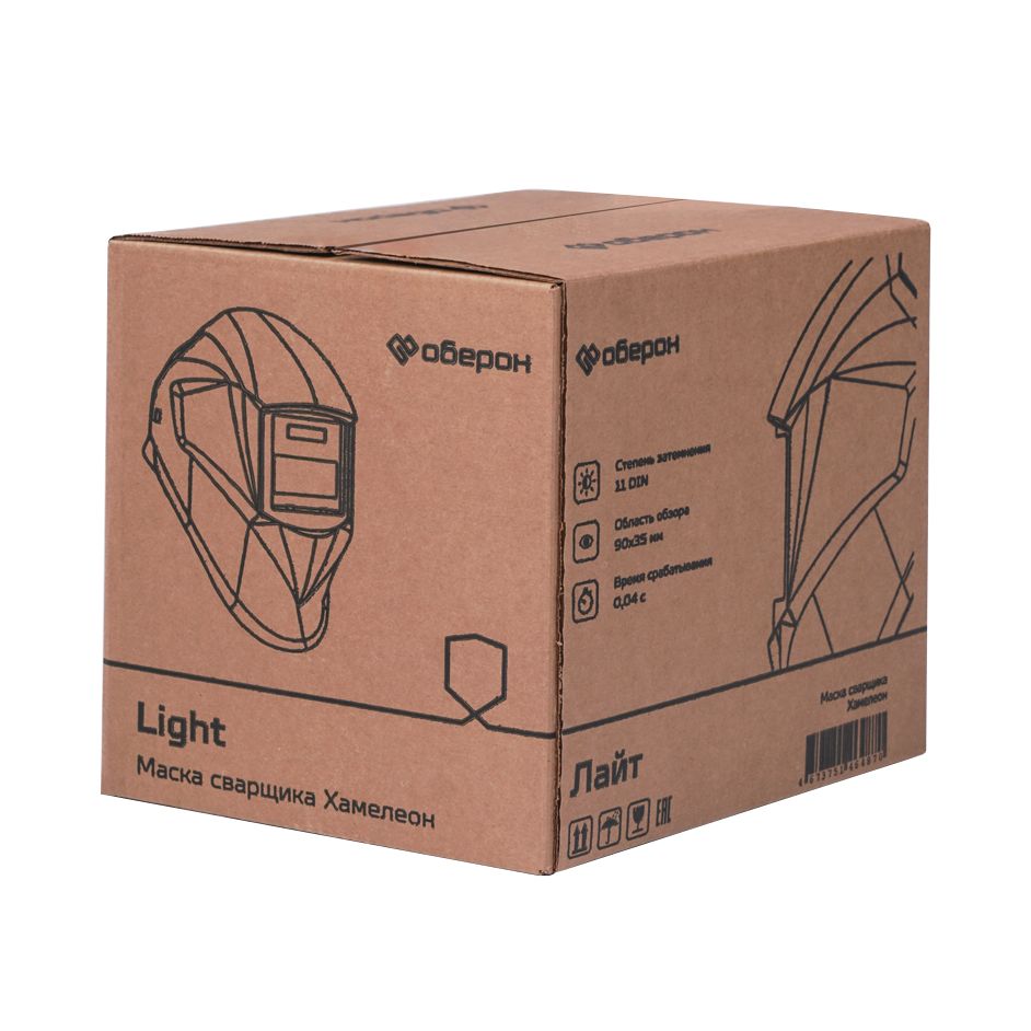 Сварочная маска с автоматическим светофильтром Хамелеон Оберон light с автоматическим светофильтром защищает глаза и кожу лица сварщика от искр, брызг и вредного излучения при нормальных условиях сварки. Светофильтр типа «Хамелеон» обеспечивает автоматическое затемнение при зажигании сварочной дуги. В качестве источника питания в маске используются солнечные аккумуляторы длительного срока эксплуатации. Скорость перехода светофильтра из светлого состояния в темное составляет 0,1 мс, таким образом глаза эффективно защищаются от повреждения мгновенного дугового света. В маске установлен светофильтр с фиксированной степенью затемнения 11 DIN. Сбалансированная и легкая конструкция, специальная поворотная система крепления значительно снижают усталость головы и шеи сварщика и повышают комфорт. Продукция изготовлена в соответствии с ГОСТ 12.4.254-2013 «Система стандартов безопасности труда. Средства индивидуальной защиты глаз и лица при сварке и аналогичных процессах. Общие технические условия». Меры предосторожности: 1. Маска не предназначена для: лазерной и кислородно-ацетиленовой сварки/резки; защиты от взрывоопасных устройств или коррозионно-агрессивных жидкостей; защиты от серьезных ударов. 2. Не рекомендуется использовать, если дуга мерцает или просто накалена. В таком случае необходимо провести пробу перед использованием. 3. Запрещается вскрывать картридж светофильтра. 4. Запрещается класть маску и светофильтр на горячую поверхность. 5. Запрещается протирать растворителями экран светофильтра или детали маски. 6. Запрещается погружать фильтр в воду. 7. Стандартные защитные стекла должны быть установлены на внутренней и внешней поверхностях фильтра. Неправильное использование защитных панелей может быть опасно и привести к повреждениям маски. 8. Если фильтр не темнеет после зажигания дуги, немедленно прекратите сварку и свяжитесь с техническим специалистом или дилером. 9. Использовать маску только при температурах от -5°С до +60°С. 10. Храните маску и светофильтр в сухом, прохладном месте, когда маска не используется в течении длительного времени. 11. Предохранять фильтр от контакта с жидкостью и грязью. 12. Регулярно очищать поверхность фильтра, не использовать сильные чистящие растворы. Для очистки датчиков и фотоэлементов применять чистую ткань без содержания льна. 13. Регулярно заменять внешнее защитное стекло при появлении на ней трещин, царапин, неровностей.